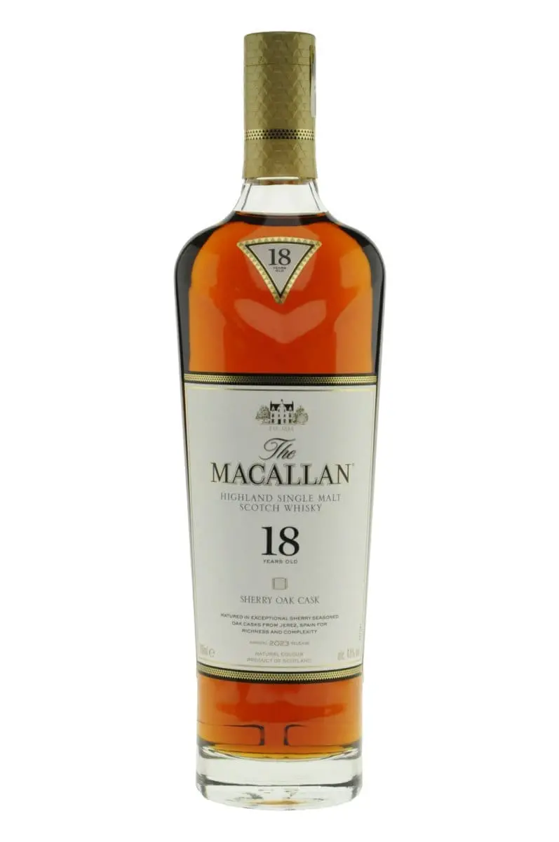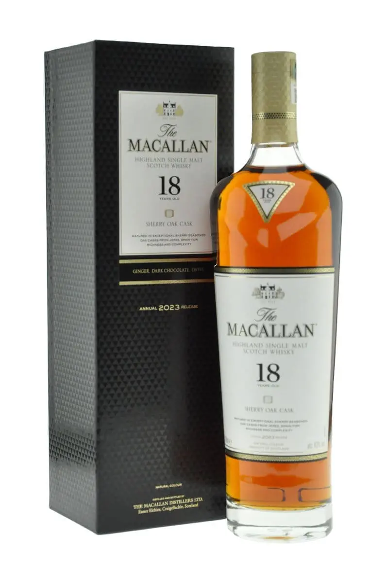Embark on a timeless sensory journey with the Macallan 18 Year Old Sherry Oak, an iconic expression from The Macallan Sherry Oak Collection. Artfully curated with premium European oak and sherry casks seasoned in Jerez de la Frontera, Spain, this 18-year-old masterpiece exemplifies the pinnacle of single malt Scotch whisky craftsmanship.